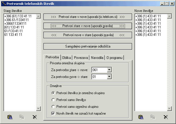 Pretvornik telefonskih številkPretvornik telefonskih številk je program, s katerim lahko pretvorite množico telefonskih številk iz stare oblike v novo in obratno. Za pretvorbo lahko uporabi Telekomov spletni imenik tis.telekom.si ali seznam pravil. Pretvornik telefonskih številk deluje v okoljih Windows 95, Windows 98, Windows NT 4 in Windows 2000.